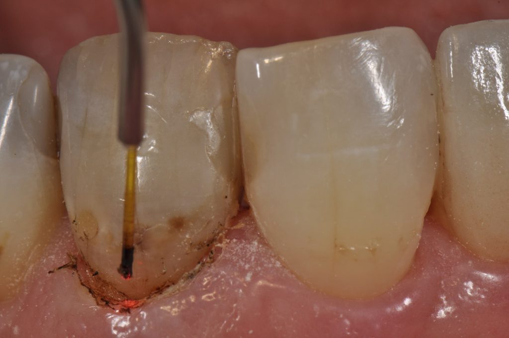 The amazing Ultradent Gemini diode laser (810nm and 980nm) was used to adjust the gingival margins prior to a transsulcular osseous recontouring approach using the Kois Wedelstaedt chisel (Brasseler USA), re-establishing the 3mm biologic width mid-facially and 4mm at the proximofacial line angles. The Gemini uses different wavelengths for different therapeutic actions – 980nm is attracted to the water content more resulting in more efficient coagulation and cutting. It has been used in pain relief and inflammation reduction protocols. 810nm requires carbonization of the tip to account for its lesser absorption (10 times less than 980nm) but is an efficient “cutter”). Probably the most powerful and efficient cutting I have seen from any diode to date. After soft tissue resolution in approximately 3 weeks, we will be able to proceed with resin bonding on a case that is now more likely to be balanced to the eye.