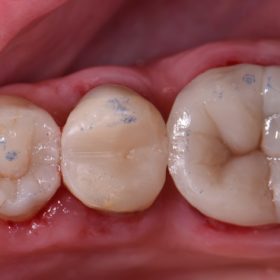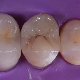 Screw-access biomimicry: Implant screw access occlusion using White Tint #EssentiaModifiers and AO2 #GC #GaenialAnterior along with #OptiglazeColor orange mixed with a tinge of brown for the triangular ridges.