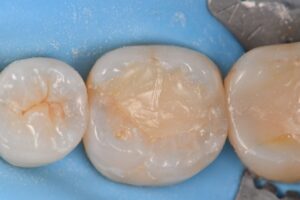 This lovely patient exhibited pain on biting the occlusal aspect of this relatively new Cerasmart inlay completed by a dentist in Rotorua. The restoration was removed and a microlayered base was placed before lobe-by-lobe reconstruction of the occlusal anatomy using a single shade of Kerr Simplishade Light.