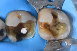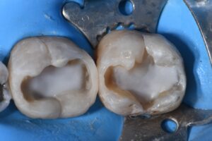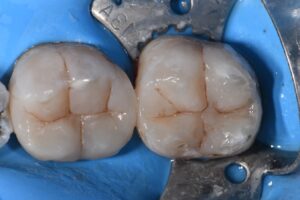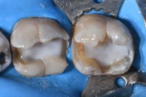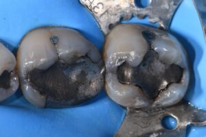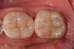 A long-term complex transitional direct restoration was completed on these molars prior to planned orthodontics to remove cracks and stabilize the tooth structure with full coverage indirect planned for immediately post-alignment.