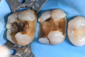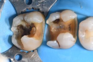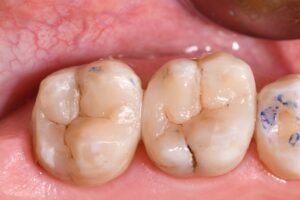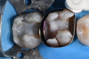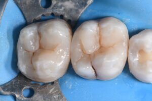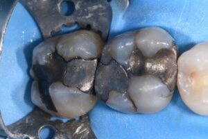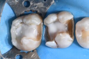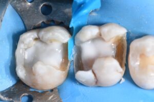 Complex direct resin reconstruction of these two heavily-restored molars. The Rhondium DME wedge was utilized to “even out” the irregular cavosurface margin to create a more linear adaptation. Matrix in matrix (Omnimatrix, Ultradent Products, Inc. and Dead Soft Matrix band, Garrison Dental Solutions – North America) utilized to control a wall-by-wall conversion of these large Class II’s to Class I situations. Dark dentin bases neutralized using a superwhite opaque flowable in microlayers. Kerr Simplishade Bulk Fill flowable was used in a single shade for the microincrements that represented the layered base Marginal ridges and capping composite comprised a single-cloud shaded composite.
