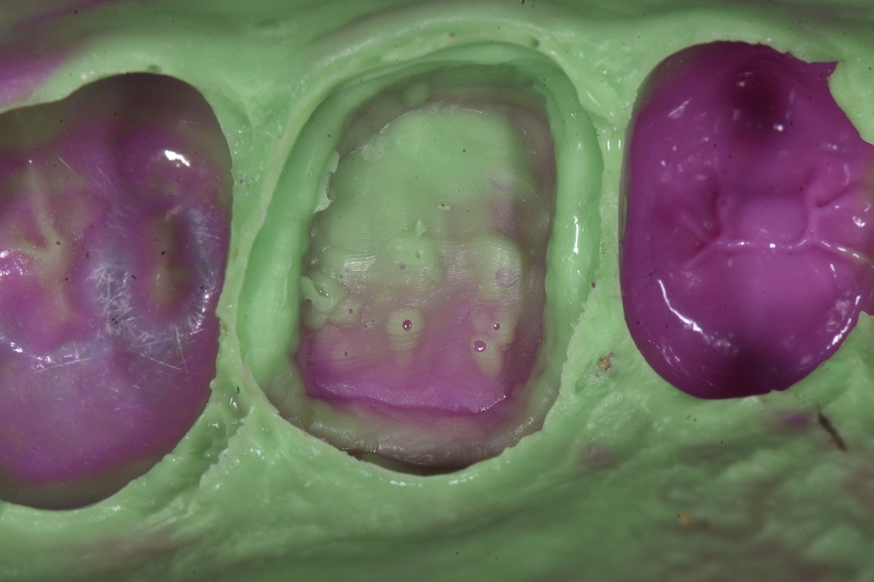 I had the opportunity to reinforce a structurally compromised tooth using Standard 3/4 crown prep with palatal reduction and light chamfer to preserve the bulk of enamel in this area. Buccally, remember e-max can be honed down to 0.3mm, hence the ultra-thin buccal reduction. This tooth should now be much more protected against catastrophic fracture than with the extra-large composite restoration with thin residual M wall. Provisional material: Voco Structur Premium A2. Stain: Voco Final Touch Brown and White.
