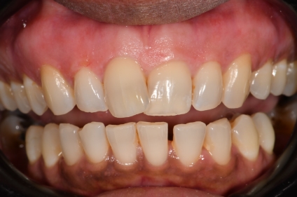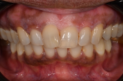 Gingival depigmentation using a surgicolaser approach to expedite healing. Upper arch done for comparison