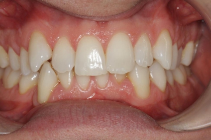 Before view #2: One can really see her upper lateral incisors are sticking out. Her central incisors (middle teeth) have old composite bonding and the midline is tilted to her left side.
