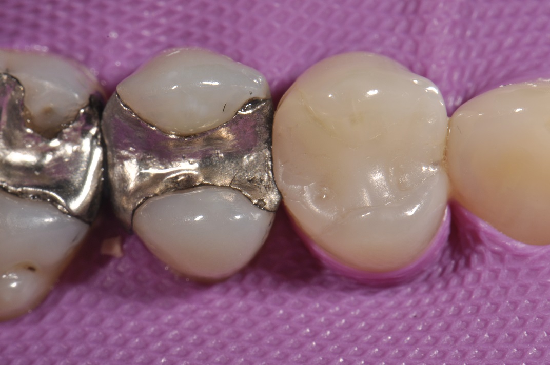 Problem: there is a large gap between the metal filling and tooth structure. The tooth next door has a crack in the marginal ridge and shows recurrent decay on X-ray.